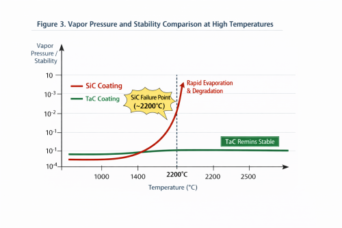 অতুলনীয় থার্মোডাইনামিক স্থিতিশীলতা: ট্যানটালাম কার্বাইড (TaC) 3880°C এর একটি বিস্ময়কর গলনাঙ্কের গর্ব করে। জার্নাল অফ ক্রিস্টাল গ্রোথ-এর গবেষণা অনুসারে, SiC আবরণগুলি 2200°C-এর উপরে "অসঙ্গত বাষ্পীভবন"-এর মধ্য দিয়ে যায় - যেখানে সিলিকন কার্বনের চেয়ে দ্রুততর হয়, যা কাঠামোগত অবক্ষয় এবং কণা দূষণের দিকে পরিচালিত করে। বিপরীতে, TaC এর বাষ্পের চাপ 3 থেকে 4স্ফটিক বৃদ্ধির জন্য একটি আদি তাপীয় ক্ষেত্র বজায় রাখা, SiC থেকে কম মাত্রার আদেশ।