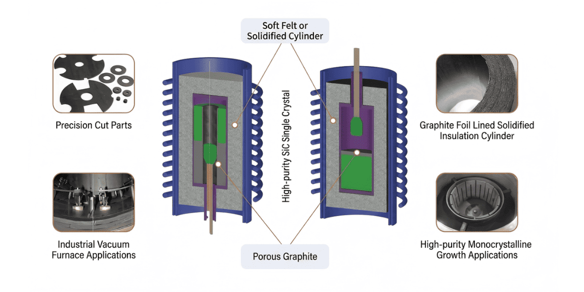 অর্ধপরিবাহী উত্পাদন:এটি মনোক্রিস্টালাইন সিলিকন এবং SiC ক্রিস্টাল গ্রোথ ফার্নেস সেটআপের জন্য একটি মূল নিরোধক স্তর।